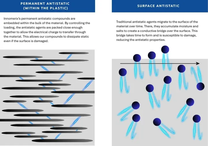 Through use of carbon fibre and other fillers, we have created a line of conductive and static dissipative compounds. Carbon fibre gives these materials an incredible strength-to-weight ratio and when combined with other additives act as a percolating network to dissipate static charge. This means the compounds have a permanent antistatic effect.